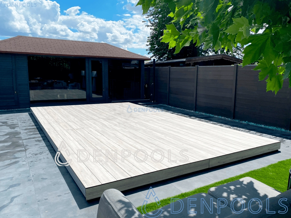 Si noti che l'installazione di questo sistema di decking è adatta solo per le piscine che si trovano allo stesso livello del terreno circostante, cioè la piscina deve essere installata senza sporgere, cioè non deve sporgere sopra il livello zero.